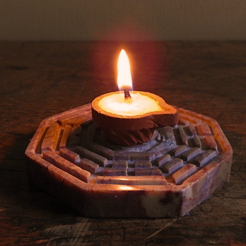 - Materiaal: natuurlijke ghee, katoenen wiek, terracotta potje